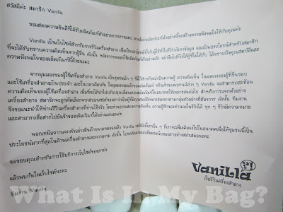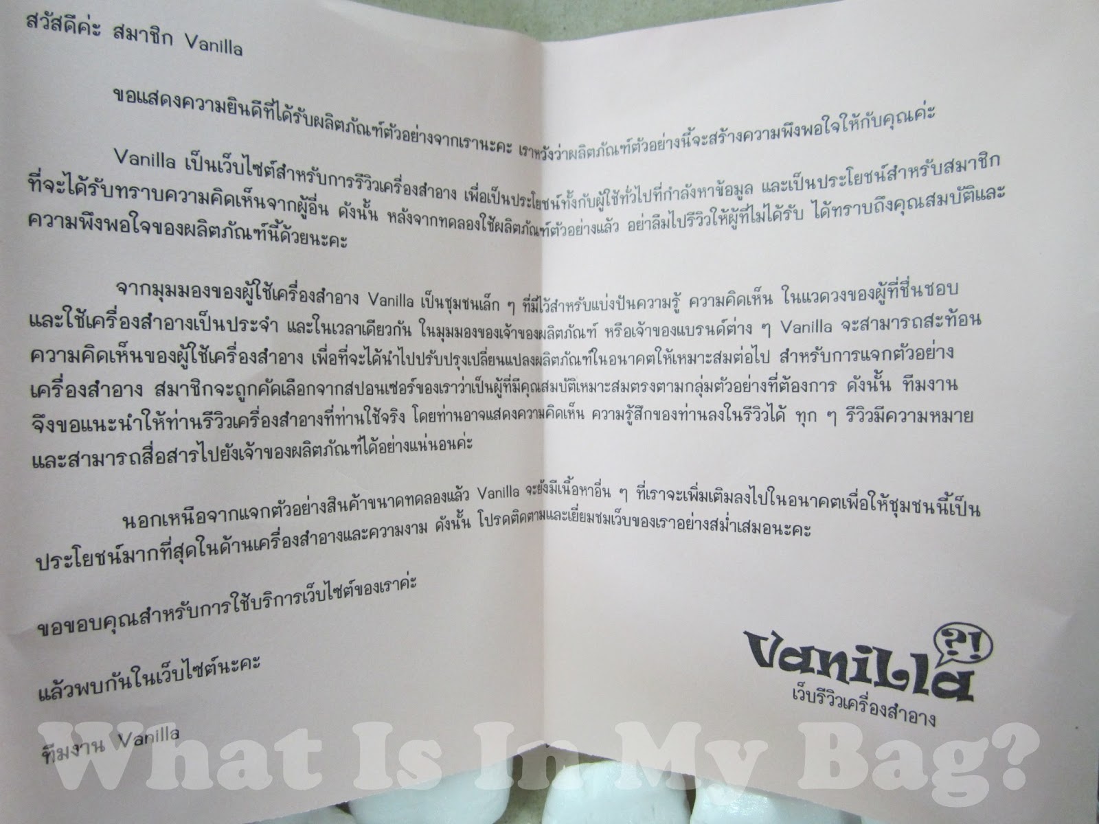 มีจดหมายเล็ก ๆ แนบมาด้วย น่ารักจัง เราได้เทสเตอร์จากวนิลาบ่อยเหมือนกันนะ ครั้งแรกรู้สึกจะเป็น Vitacreme B12 หลอดสีชมพู, ต่อมาก็แป้งน้ำ Zitt แล้วล่าสุดก็ได้ Vichy Normaderm Total Mat Oil and Shine Control gel แต่ก็ไม่ค่อยได้รีวิวให้เท่าไหร่ กราบขอบคุณและขอประทานอภัยมา ณ ที่นี้ด้วย