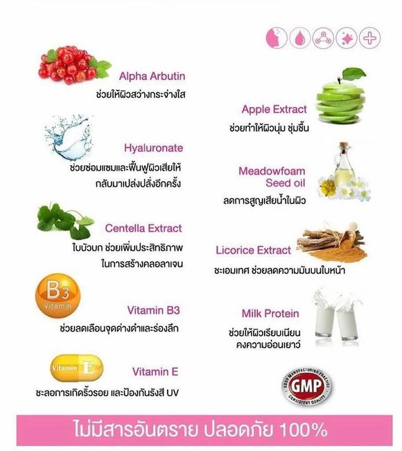 ส่วนผสมธรรมชาติสุดพิเศษที่ผ่านการคิดค้นจากผู้เชี่ยวชาญและพัฒนาสารสกัดที่มีอยู่ในธรรมชาติ รังสรรค์เป็นครีมบำรุงผิว โดยมีส่วนผสมอย่าง ใบบัวบก (Centella Extract) ช่วยเพิ่มประสิทธิภาพในการสร้างคลอลาเจน, ชะเอมเทศ (Licorice Extract) ช่วยลดความมันบนใบหน้า, แอปเปิ้ลเขียว (Apple Extract) ช่วยทำให้ผิวนุ่มชุ่มชื้น, นมโปรตีน ช่วยให้ผิวเรียบเนียนคงความอ่อนเยาว์, สารสกัดจาก Alpha Arbutin ช่วยให้ผิวสว่างกระจ่างใส, Hyaluronate ช่วยซ่อมแซมและฟื้นฟูผิวเสียให้กลับมาเปล่งปลั่งอีกครั้ง , Vitamin B3 ช่วยลดเลือนจุดด่างดำและร่องลึก , Vitamin E ช่วยชะลอการเกิดริ้วรอยและป้องกันรังสี UV. เติมความชุ่มชื้นคืนสู่ผิวสาวอีกด้วย