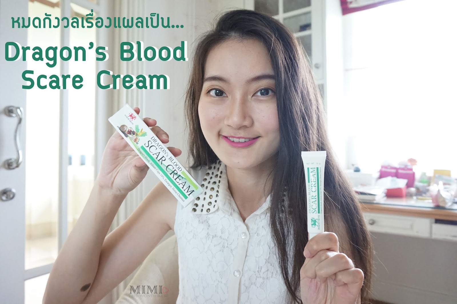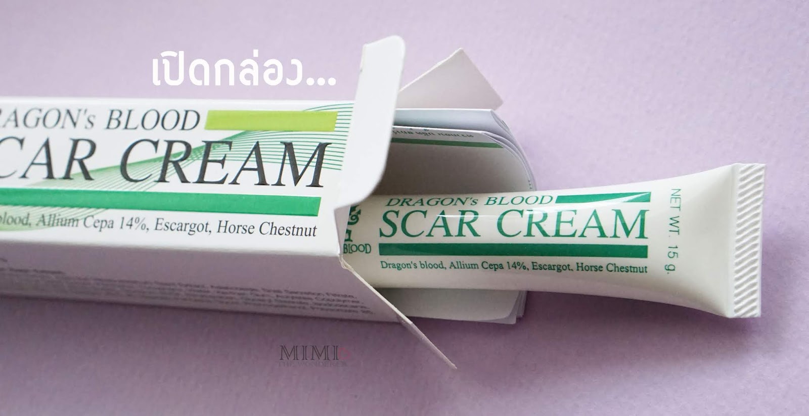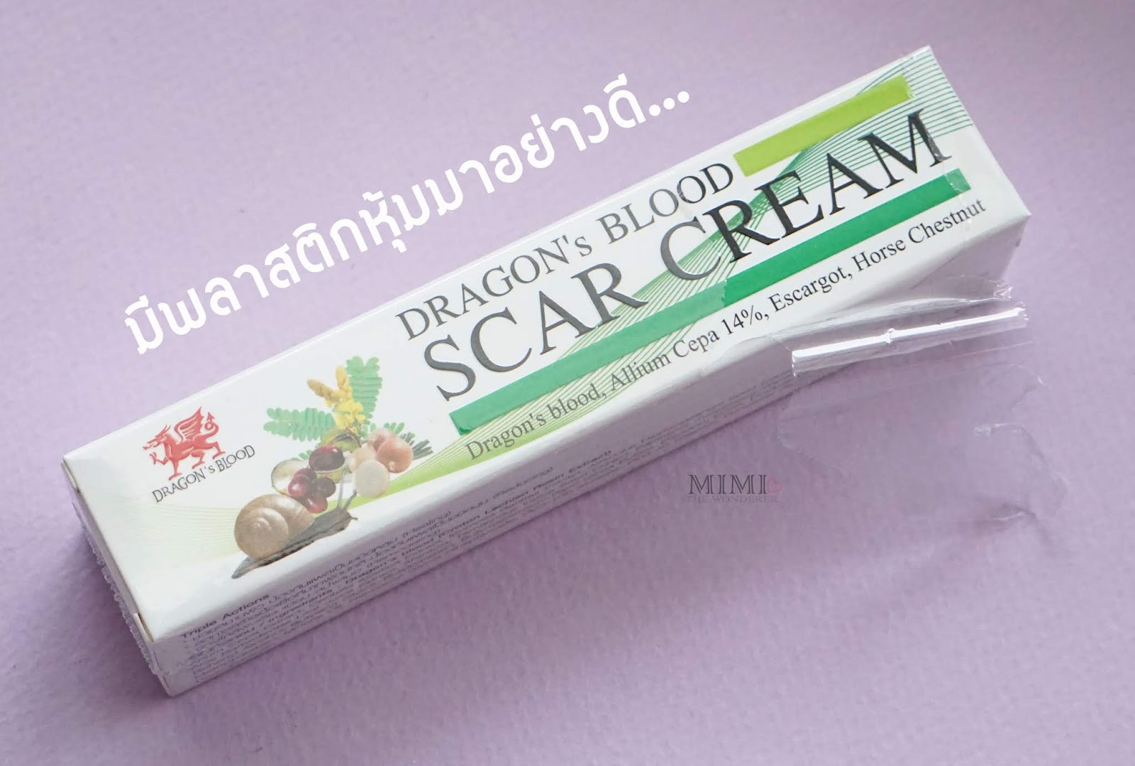 วันนึงขณะเดินอยู่ในร้านขายยา (ก็ชอบไปซื้อวิตามิน, น้ำยาล้างตา ฯลฯ) ปกติมี่ก็จะชอบเดินดูผลิตภัณฑ์ใหม่ว่าเดือนนี้มีอะไรบ้างนะ มี่ก็เจอครีมหลอดสีเขียว Dragon's Blood Scar Cream หลอดที่มี่จะนำมารีวิววันนี้ค่ะ มี่ก็เลยคิดว่า น่าจะลองเอามาใช้ดู เผื่อรอยแผลเป็นที่มีจะหาย หรือไม่ก็จางลงหน่อย ที่เลือกเพราะ Pacakging เค้าดูดี ออกแนวสากล คือเน้นโทนขาว - เขียวเป็นหลัก เลยให้ความรู้สึกถึงธรรมชาติ เกิดความรู้สึกว่า เออ...ต้องปลอดภัยแน่เลย 5555 ก็เลยสอยมาเลยค่ะ เค้ามี 2 ขนาด คือ หลอดเล็ก 5 กรัม และหลอดใหญ่ 15 กรัมค่ะ มี่ซื้อหลอดใหญ่มาเลย เพราะรู้สึกว่าคุ้มค่าาาาา