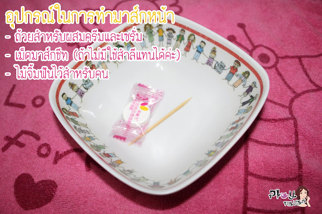 - ถ้วยเล็กไว้สำหรับผสม 1 ใบ, เม็ดมาส์กชีท 1 เม็ด (ถ้าไม่มีใช้สำลีแบบแผ่น 2 แผ่นแทนได้ค่ะ),ไม้ จิ้มฟันไว้สำหรับคนค่ะ