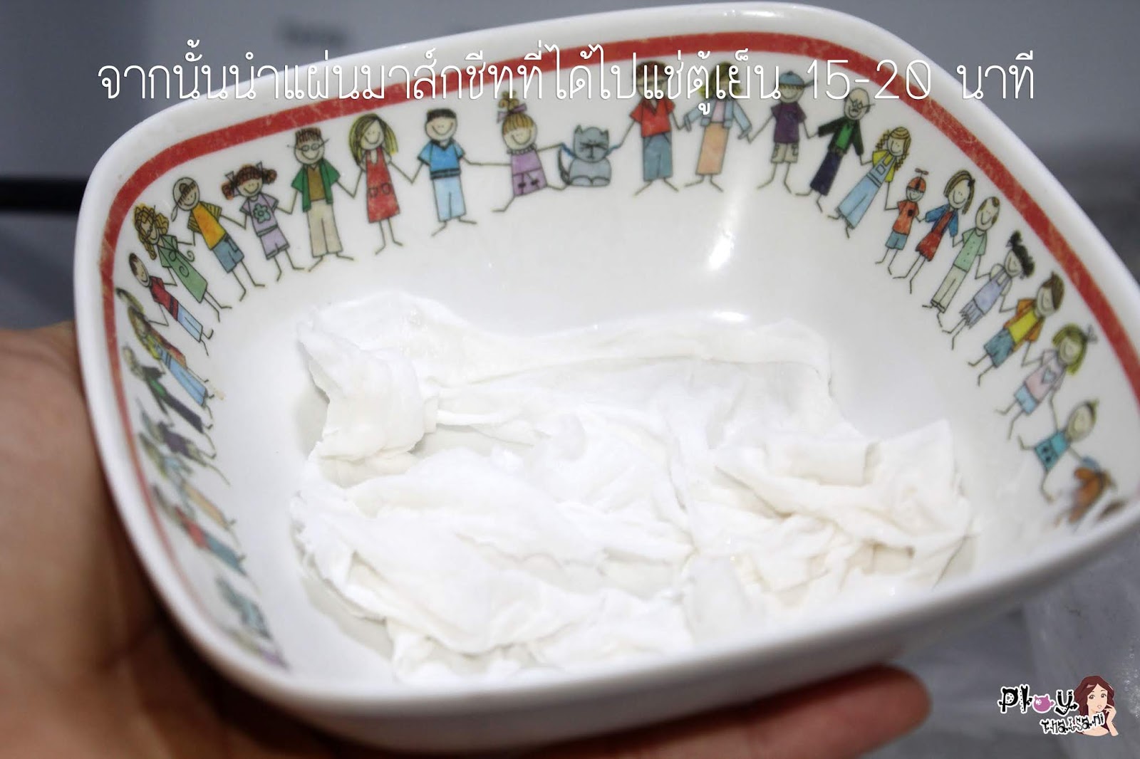 จากนั้นนำมาส์กที่ได้ไปแช่ตู้เย็นสัก 15-20 นาทีค่ะ เนื้อครีมที่ผสมไว้ก็จะซึมเข้าสู่มาส์กชีทของเราจนหมด