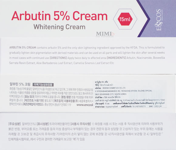 Arbutin 5% Cream (Whitening Cream) ตัวนี้ ขอเรียกสั้นๆว่า ครีมอาร์บูติน นะคะ อยู่ภายใต้แบรนด์ที่ชื่อว่าE&COS Dermo Cosmetics จากประเทศเกาหลีครีมตัวนี้ ได้รับการรับรองจาก KFDA (องค์กรอาหารและยาของประเทศเกาหลี)ว่าใส่ส่วนผสมที่ปลอดภัยต่อผิว จุดเด่นของเค้าเลย คือมีอาร์บูตินมากกว่าครีมทั่วไป และอยู่ในรูป อัลฟ่า อาร์บูติน จึงให้ผลลัพธ์ที่เร็วและปลอดภัย เพราะจะไม่ทำให้ผิวระคายเคืองค่ะ…ส่วนผสมหลักได้แก่ Arbutin, Niacinamide,Coswellia Serrata Resin Extract, Aloe Barbadensis Leaf Extract, CamelliaSinensis Leaf Extract ดูคร่าวๆแล้วก็คือส่วนผสมจากธรรมชาตินั่นเอง ซึ่งมีคุณสมบัติในการลดรอยด่างดำ รอยสิว และผิวอักเสบจะช่วยให้ผิวขาวกระจ่างใสขึ้นเมื่อใช้อย่างต่อเนื่องค่ะ