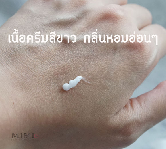 เนื้อครีมสีขาว กลิ่นหอม เนื้อเข้มข้นแต่เกลี่ยง่าย ซึมไว ไม่เหนียวเหนอะหนะ