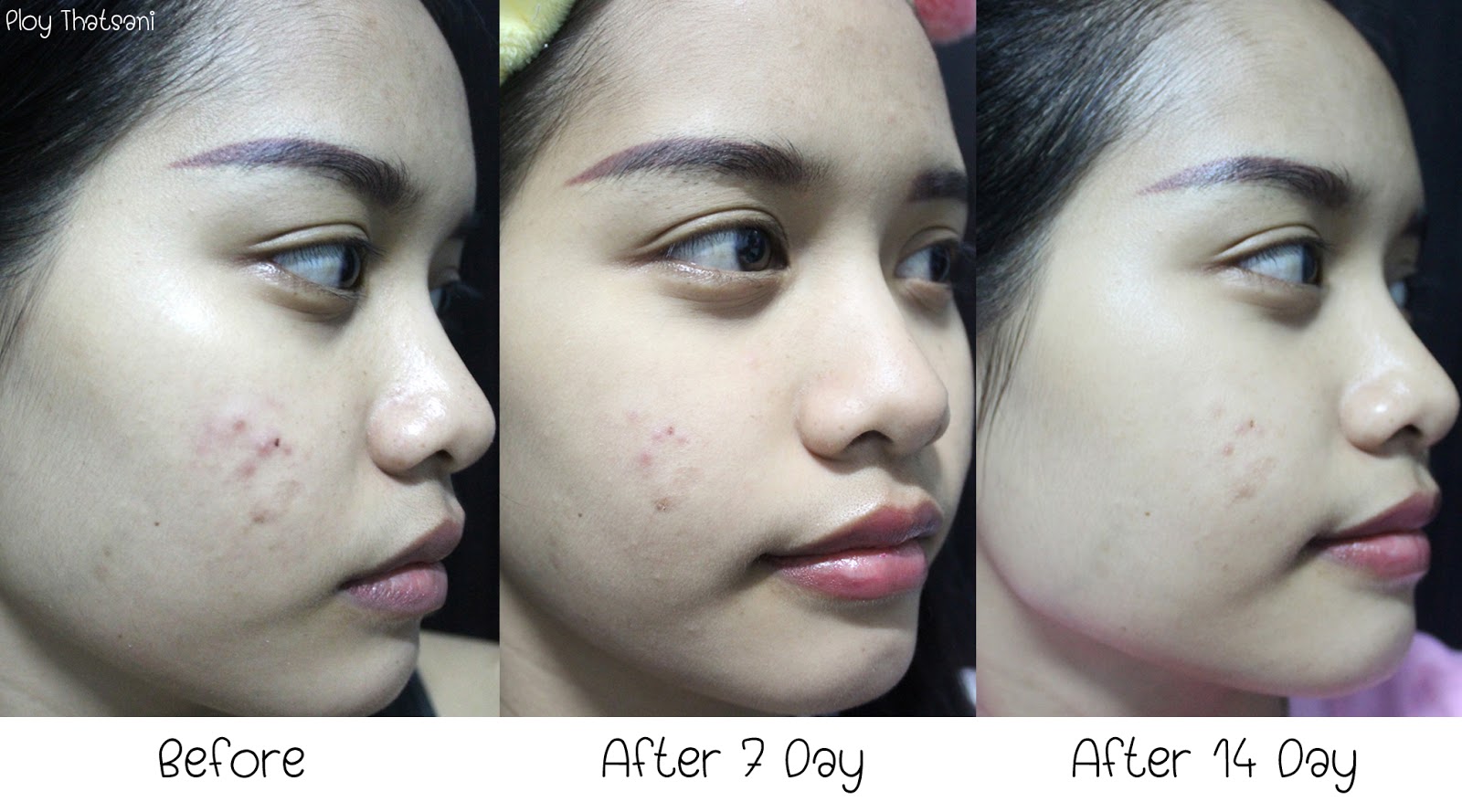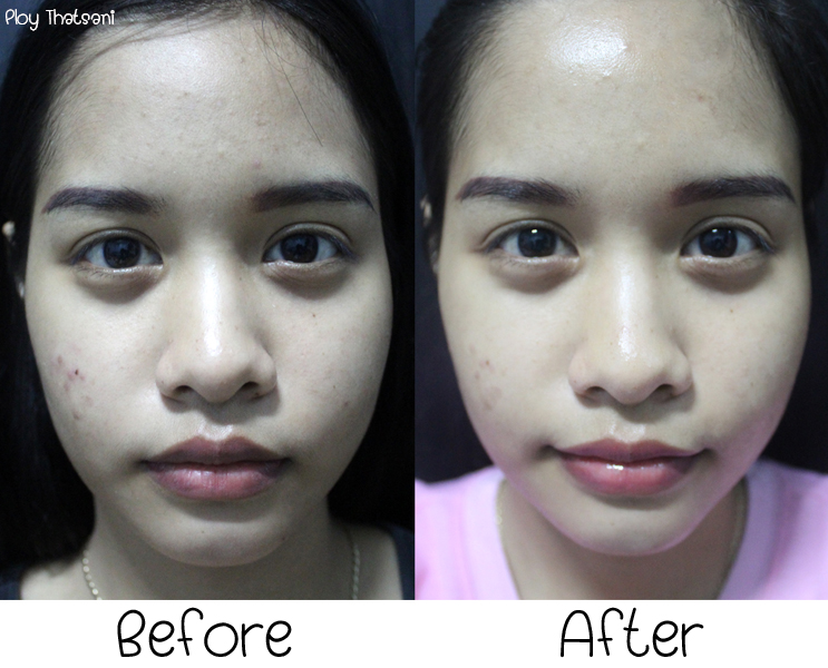 รอยสิว รอยจุดด่างดำ จางลงอย่างชัดเจนแต่ยังไม่จางหมดเกือบ 100% นะคะ กระก็ดูจางลง และผิวหน้ามีความกระจ่างใสขึ้นอย่างเห็นได้ชัด แต่สิวอักเสบกลับยุบตัวลงด้วยเหมือนกันค่ะ ผิวหน้าดูเรียบเนียนเด้งขึ้นค่ะ