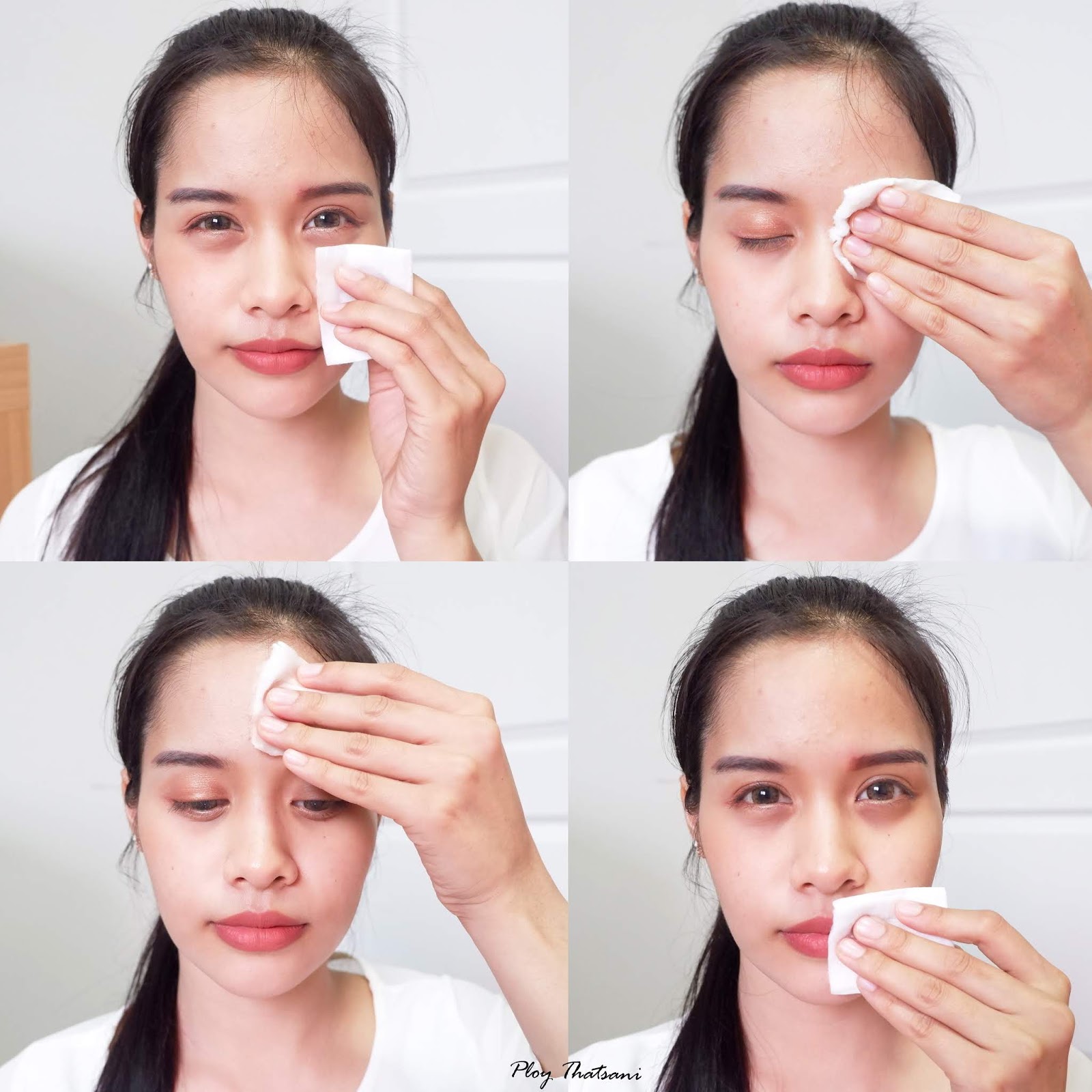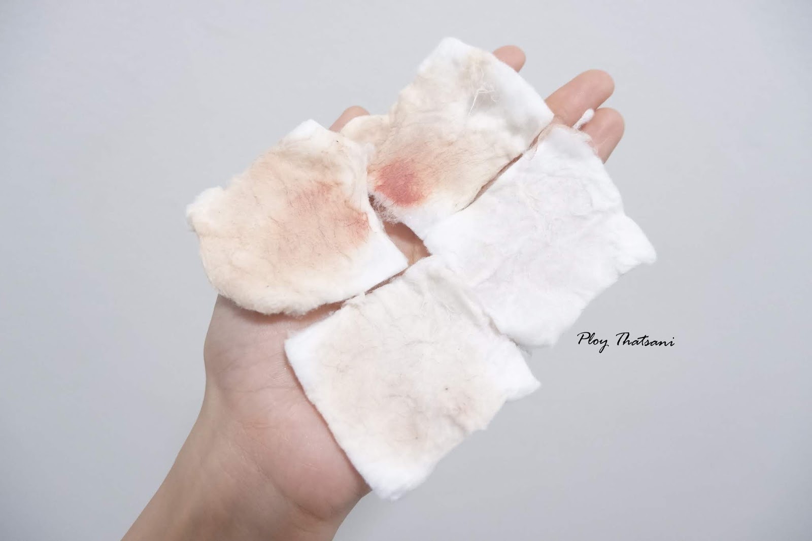 ลองทดสอบประสิทธิภาพการลบล้างเมคอัพดู ก็จัดว่าโอเคค่ะ ไม่ต้องออกแรงอย่างหนักหน่วงแต่อย่างใด...แค่แปะแผ่นสำลีที่ชุ่มคลีนซิ่งลงบนผิวไว้สัก 20 - 25 วินาทีแล้วเช็ดออกเบาๆ พวกรองพื้น ลิปสติก บลัชออนก็หลุดออกได้ง่ายอยู่ แต่สำหรับพวกเมคอัพที่มีประสิทธิกันน้ำ กันเหงื่ออย่างมาสคาร่า อายชาโดว์ อายไลนเนอร์ไรงี้ก็จะต้องเช็ดซ้ำถึง 3 รอบนะจ๊ะถึงจะเกลี้ยงเกลา