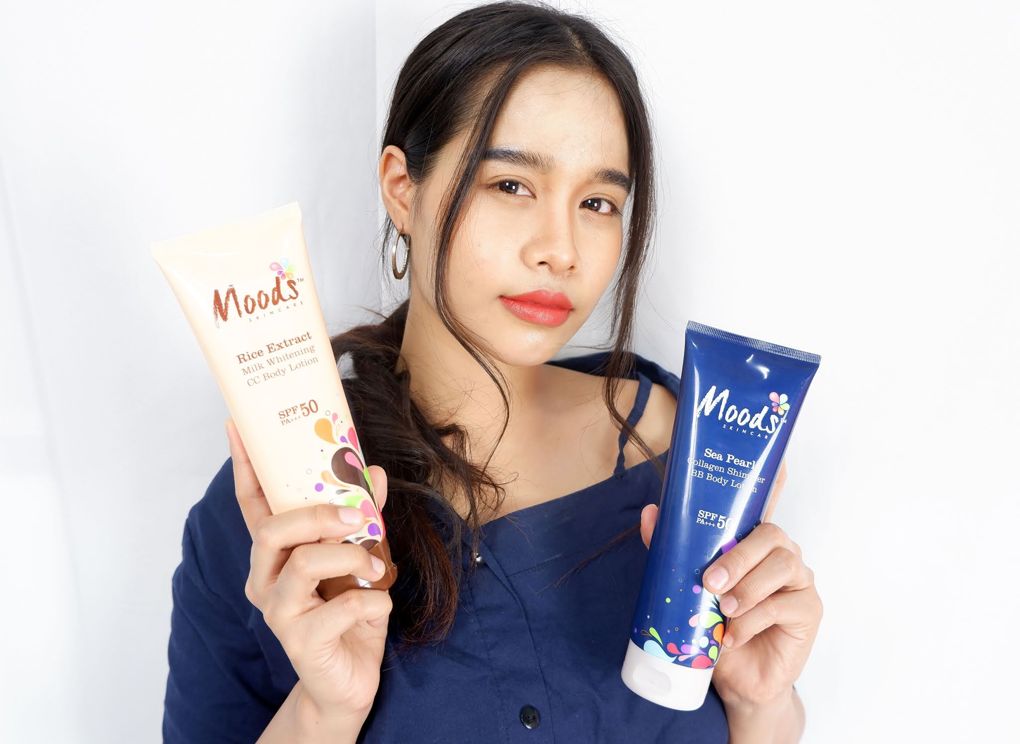 สำหรับไอเท็มเคล็ดลับผิวสวยที่พลอยเลือกมาใช้ในครั้งนี้ก็คือ บีบีหลอดน้ำเงิน และ ซีซีหลอดน้ำตาล โลชั่นทาผิวกายปรับสภาพผิวขาวกระจ่างใสเร่งด่วน Moods หลอดนี้ค่ะ