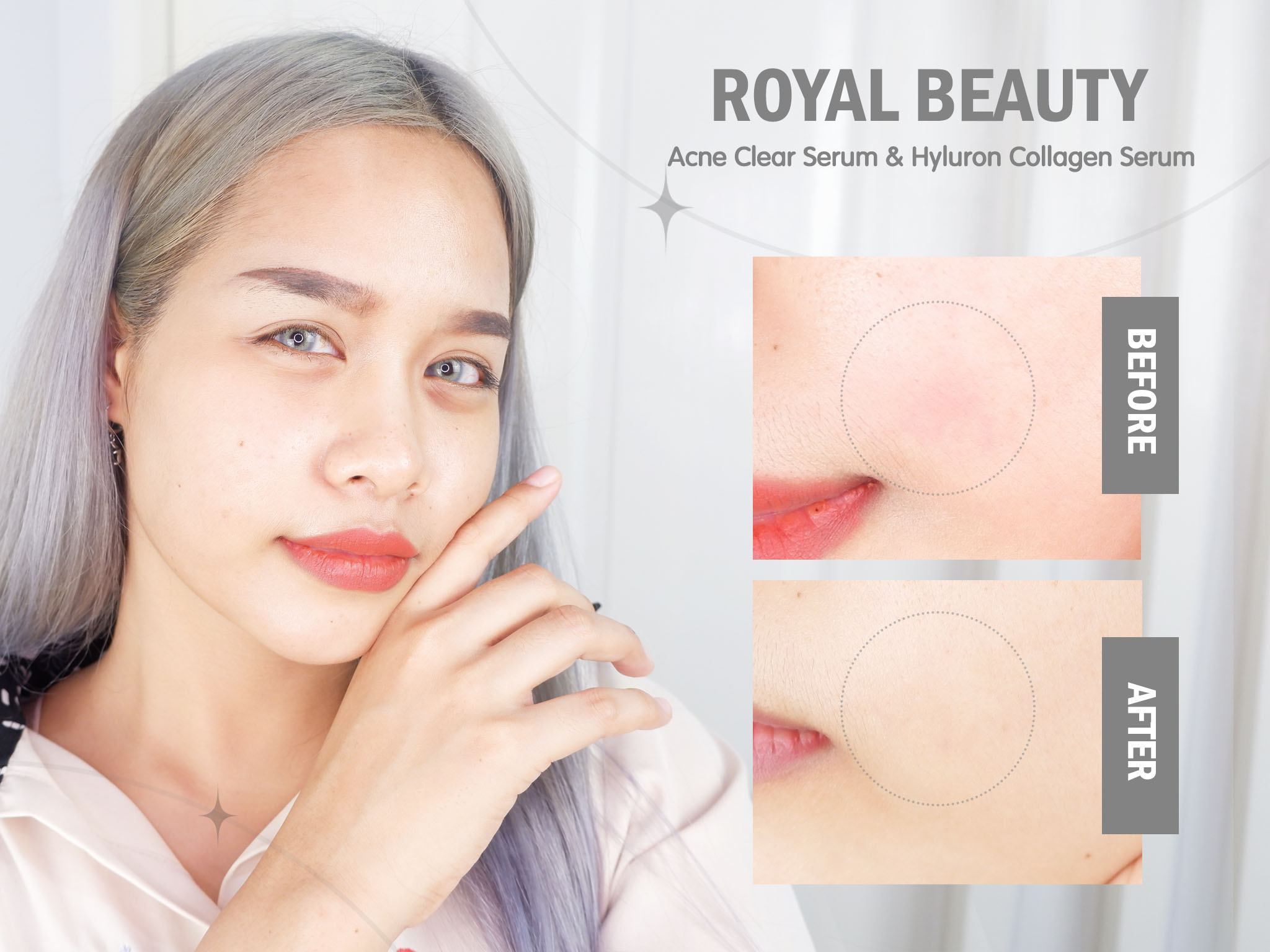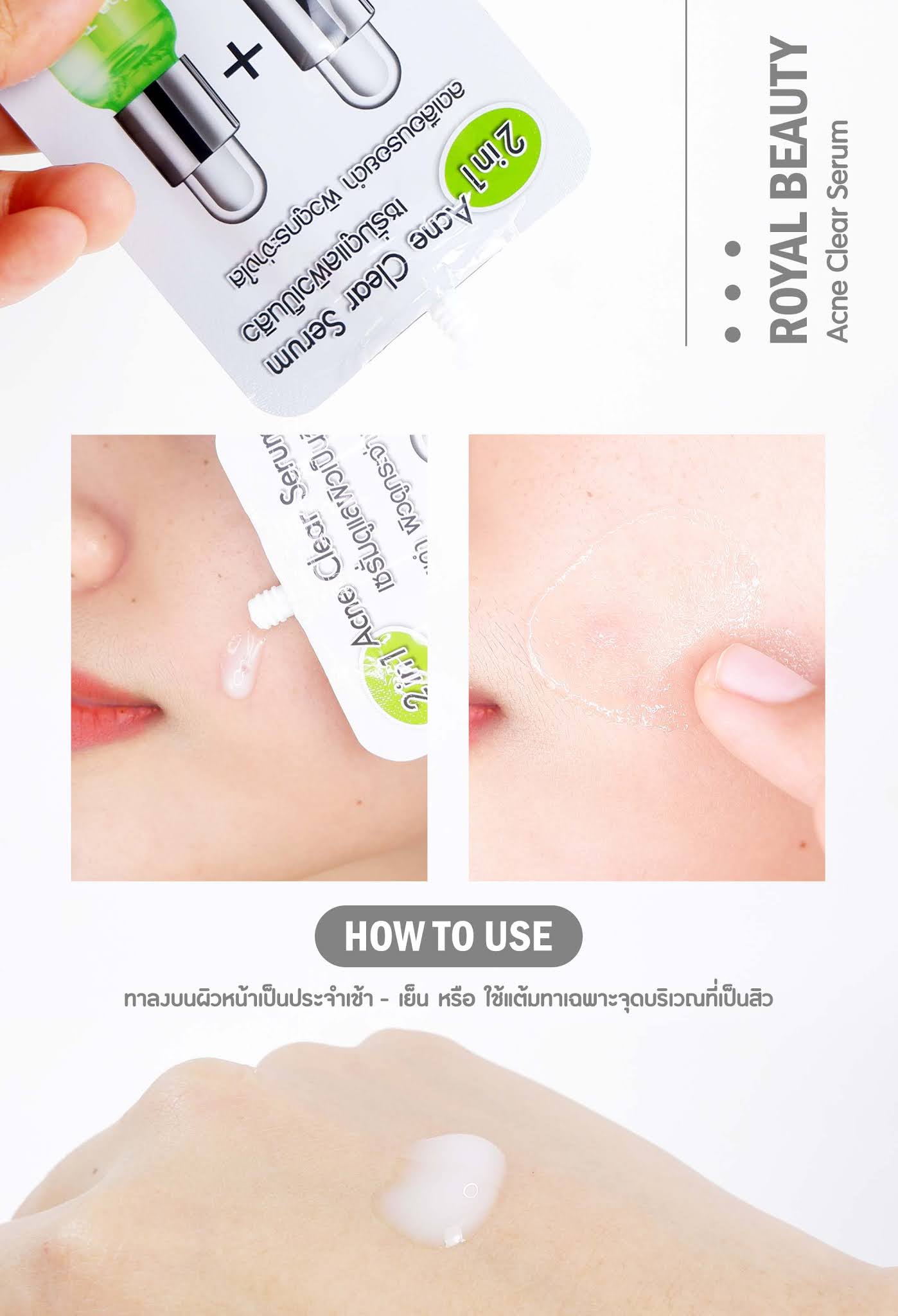 แอคเน่ เคลียร์ เซรั่ม เคลียร์ปัญหาสิว ครีมซองสูตรใหม่จากรอยัล บิวตี้ ที่พัฒนามาเพื่อผิวผู้ที่มีปัญหาสิว มีรอยสิว โดยเฉพาะ ตัวนี้เป็นเซรั่มสูตรเข้มข้น แต่บางเบา ซึมไว ไม่เหนียวเหนอะหนะ พร้อมทั้งยังอุดมไปด้วยสารสกัดจากธรรมชาติ อาทิเช่น