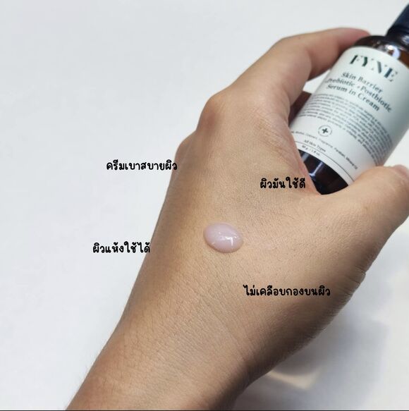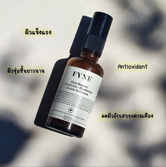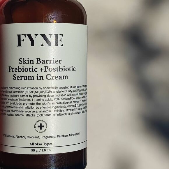 FYNE Skin Barrier +Prebiotic +Postbiotic Serum in Cream นางคือครีมที่มีเนื้อสัมผัสบางเบา จุดเด่นคือเสริมความแข็งแรงให้กับผิวและลดการระคายเคือง อักเสบ ผิวแห้งแดงต่างๆ แถมยังอ่อนโยนต่อทุกสภาพผิวแม้ผิวมีสิวง่ายก็สามารถใช้ได้ ยิ่งใช้ยาสิวหรือเรตินอลอยู่ด้วยนะใช้คู่กันคือดีมาก