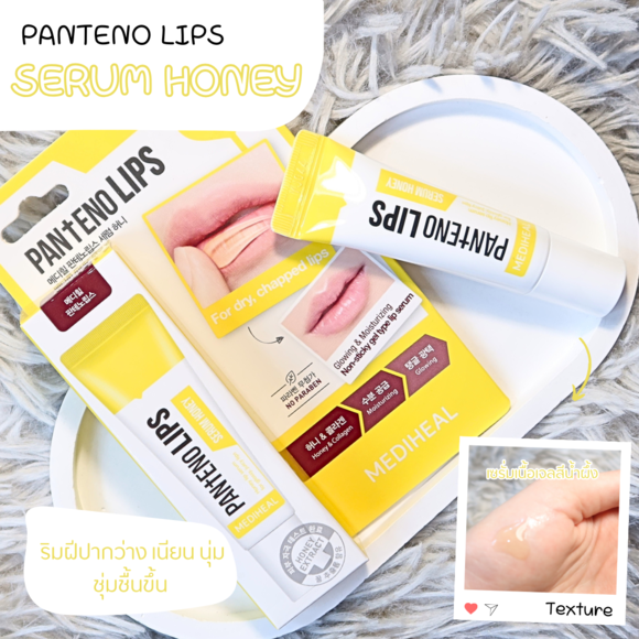 ตัวสุดท้ายของวันนี้ เป็นลิปเซรั่มเนื้อเจลสีน้ำผึ้ง ช่วยฟื้นฟูริมฝีปากที่แห้งแตกเป็นขุยให้กลับมาเนียนนุ่มชุ่มฉ่ำ ด้วยสารสกัดเด่นๆ คือน้ำผึ้ง และแพนทีนอล ผสานด้วยสารสกัดจากคอลล่าเจน ช่วยเติมเต็มร่องปาก ให้ดูกระชับ อิ่มฟู เนื้อเจลบางเบา ไม่เหนียวเหนอะหนะ บำรุงริมฝีปากได้ทุกวันเลยค่ะ