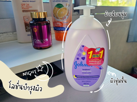 ส่วนโลชั่นบำรุงผิวในตอนกลางคืน เราใช้ของจอห์นสัน สูตร bed time ขวดสีม่วง ตัวนี้เพิ่มความชุ่มชื้นให้ผิว แถมยังช่วยให้ผิวเนียน นุ่มลื่นขึ้นด้วย