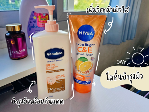 มาที่หมวดโลชั่นบำรุงผิวแบบทากันก่อน สำหรับโลชั่นทาตอนกลางวัน เราจะใช้โลชั่นนีเวีย สูตรวิตามินซี&อี เพื่อบำรุงให้ผิวใส แล้วก็ใช้โลชั่นของวาสลีน เพื่อป้องกันแสงแดดด้วย