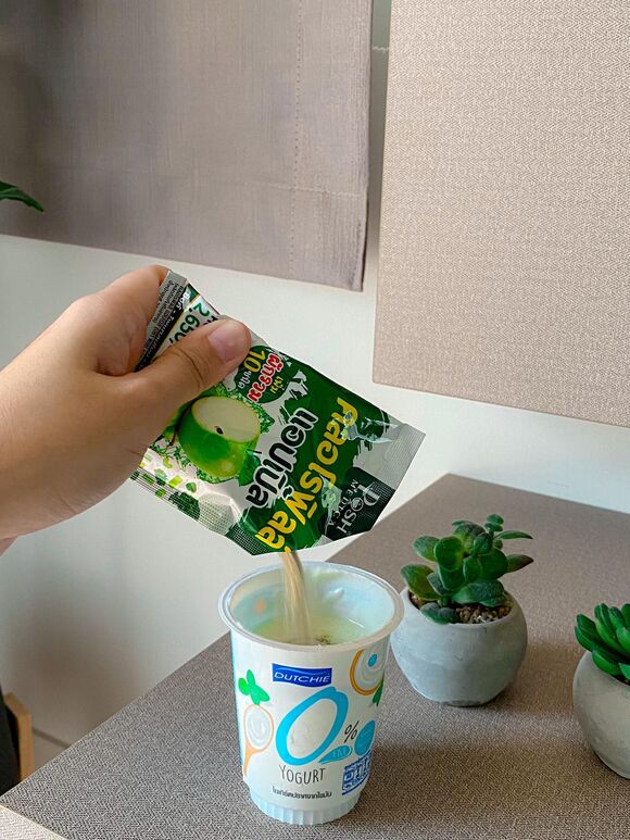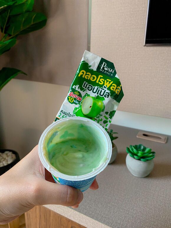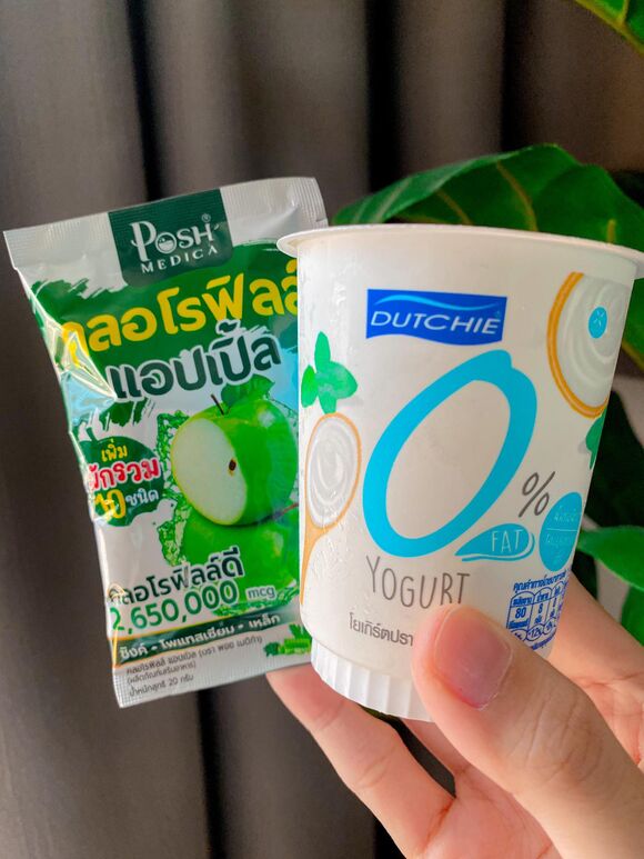 วิธีทาน : ผสมคลอโรฟิลล์แอปเปิ้ล 1 ซองกับโยเกิร์ต
