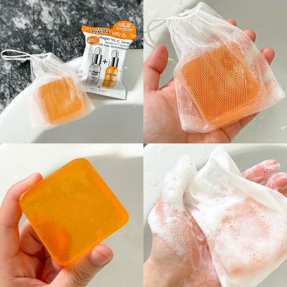 มาที่ไอเทมแรก ขั้นตอนสำคัญก่อนเตรียมผิวก็คือขั้นตอนล้างหน้านั่นเอง เพื่อผิวหน้าที่สะอาดหมดจด แก้มขอแนะนำ Collagen Vit-C Soap สบู่วิตซีผิวใส ของรอยัลบิวตี้ เป็นสบู่กลีเซอรีน ล้างแล้วผิวไม่แห้งตึง เหมาะกับทุกสภาพผิว