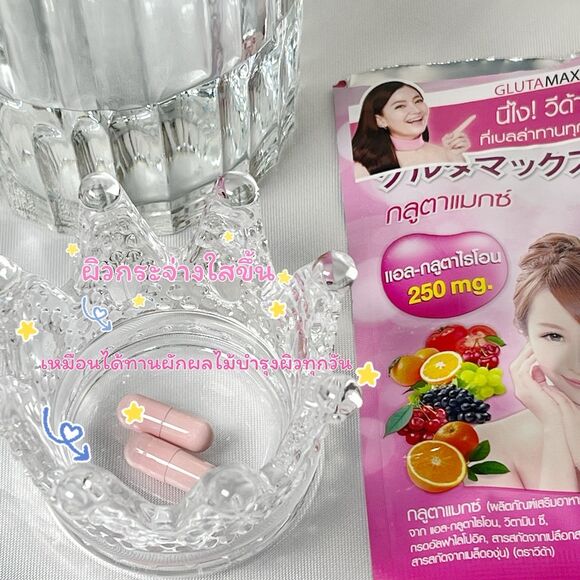 ในหนึ่งเม็ดเหมือนทานผักผลไม้ บำรุงผิวพรรณเต็มๆ ซึ่งกลูต้าแมกซ์ซองนี้จะช่วยในเรื่องของผิวที่แลดูกระจ่างใสขึ้นนอนดึกผิวก็ไม่โทรม เราทานแล้วรู้สึกผิวละเอียด ผิวใส และแต่งหน้าติดทนมากขึ้นเลยค่ะ