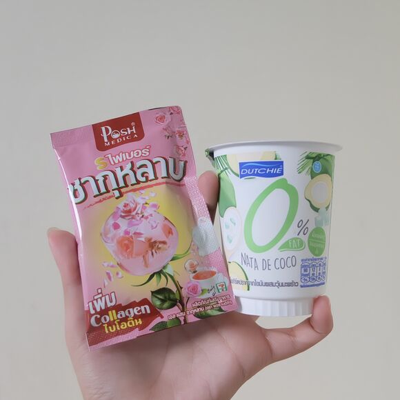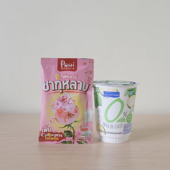 สำหรับรีวิวนี้นายมีตัวช่วยนั่นก็คือชากุหลาบตราพอชซองนี้เลย🌹 เป็นชากุหลาบของแบรนด์ Posh Medica ซองสีชมพูน่ารักสดใสมากก💖 ซึ่งนอกจากจะมีชากุหลาบ ที่น้ำตาล 0% แล้ว นายก็จะเสริมด้วยโยเกิร์ตวุ้นมะพร้าว สูตรไขมัน 0% อีกหนึ่งด้วยค่ะ