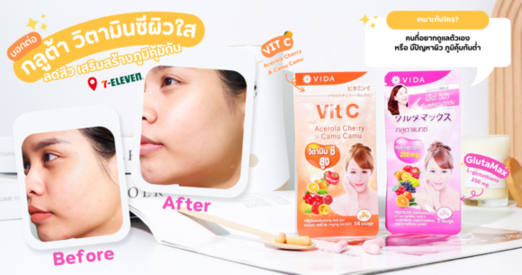 ใครที่อยากมีผิวสวย เนียนใส ไม่เป็นสิวง่าย ร่างกายแข็งแรงขึ้น ไม่ป่วยเป็นหวัดง่าย แนะนำให้ลองทานคู่จิ้นผิวใส ลดสิว เสริมภูมิคุ้มกันอย่าง Vida GlutaMax กับ Vida Vit C นี้เลย รับรองว่าประทับใจแน่นอน แถมหาซื้อได้ง่ายที่ 7-11 ทุกสาขาทั่วประเทศ และที่สำคัญราคาไม่แรงด้วยนะ