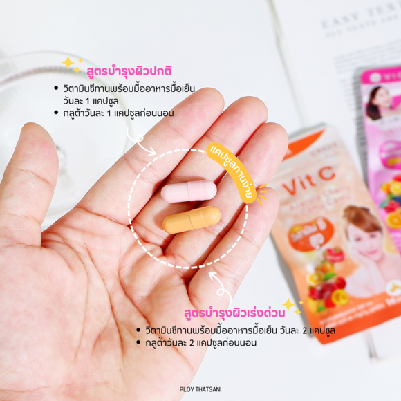 📍สำหรับวิธีทานสูตรแบบบำรุงผิวปกติก็วิตามินซีทานพร้อมมื้ออาหารมื้อเย็น วันละ 1 แคปซูล และทานกลูต้าวันละ 1 แคปซูลก่อนนอน แต่ถ้าต้องการบำรุงผิวแบบเร่งด่วนก็แนะนำให้ทานวิตามินซี 2 แคปซูลกับกลูต้า 2 แคปซูลกันไปเลย รับรองผิวสวย เนียนใสขึ้นไวภายใน 2 สัปดาห์แน่นอน!