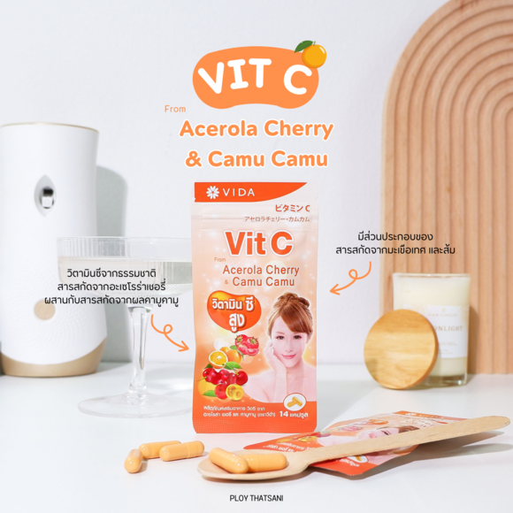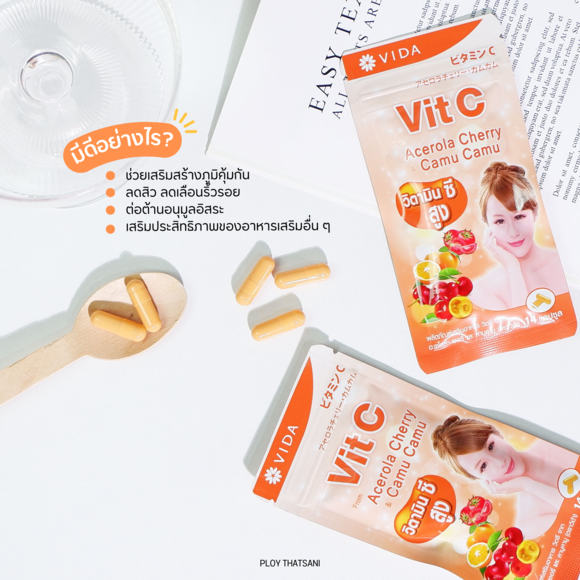 Vida Vit C ตัวนี้เป็นวิตามินซีที่มาจากธรรมชาติ🍊🌱 ที่มีส่วนประกอบหลัก คือ สารสกัดจากอะเซโรร่าเชอรี่🍒จากประเทศสวิสเซอร์แลนด์ ผสานกับสารสกัดจากผลคามูคามู🫒เข้มข้นที่เป็นสุดยอด Super Food จากประเทศบราซิล ซึ่งมีวิตามินซีสูงกว่าส้ม 30 - 80 เท่า แถมยังมีส่วนประกอบของสารสกัดจากมะเขือเทศ และส้ม จึงมีส่วนช่วยบำรุงผิวให้กระจ่างใส ริ้วรอยลดเลือนลง✨