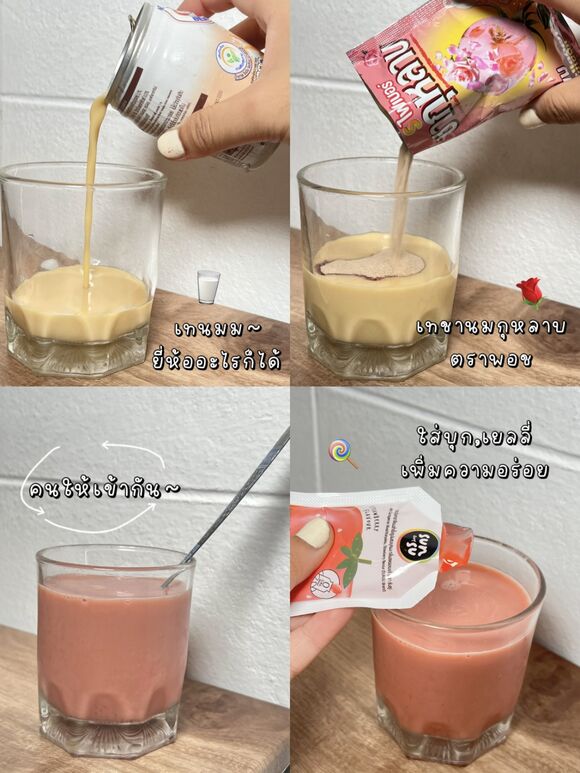 🥳ขั้นตอนแรกใส่นมลง 1 ปริมาณ 100 ml. ใส่ชากุหลาบตราพอชลงไป 1 ซองแล้วคนให้เข้ากันนน สีน่ากินมากกก แล้วปิดท้ายด้วยใส่เยลลี่ 1 กรุบ เคี้ยวเพลิน อร่อย เติมความสดชื่นด้วยการนำไปแช่ตู้เย็น🤩
