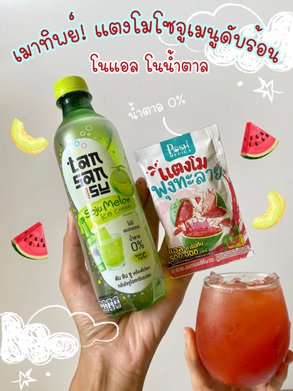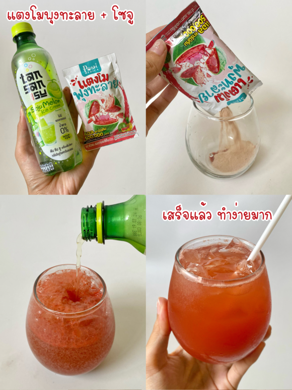 นำแตงโมพุงทะลาย และ โซจูมามิกซ์กัน ใส่น้ำแข็งหรือท็อปปิ้งอื่นๆได้ตามชอบ แค่นี้ก็ได้เมนูเครื่องดื่มดับร้อนที่อร่อยสดชื่น ไม่มีแอลกอฮออล์ ไม่มีน้ำตาล น้ำหนักไม่พุ่งแถมพุงยุบอีกด้วย✨