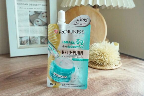และขั้นตอนสุดท้ายของจริงของวันก็คือการทามอยเจอร์ไรเซอร์ เราใช้แค่อันนี้เท่านั้น Rojukiss ซองนี้เลย เค้าเพิ่งออกมาใหม่แหละ เอามาลองใช้ดูปรากฏว่ามันดีมาก ผิวนุ่มชุ่มชื้นขึ้นในข้ามคืน เพราะเค้ามีส่วนผสมต่างๆ ที่ช่วยทำให้ผิวชุ่มชื้นขึ้น เช่น PDRN, ไฮยาลูรอนนิค 8 ชนิด, PANTHENOL และอื่นๆ คือไม่ต้องทาอะไรหลายขั้นตอนเลยใช้อันนี้แหละจบเข้านอนได้