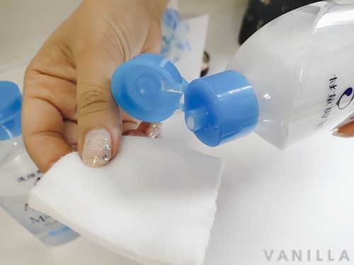 หลังจากเขย่าขวดให้ทั้ง 2 ชั้นเข้ากัน เทคลีนซิ่งลงบนสำลีแผ่น